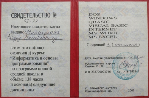 СВИДЕТЕЛЬСТВО Основы программирования